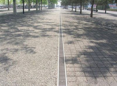 線性景觀排水溝作為景觀元素的一員,往往采用樹脂混凝土排水溝與縫隙式溝蓋板相搭配,線性排水溝的設計形式自由,根據(jù)道路的形式靈活設置。內部放置黑色鵝卵石,從景觀排水溝的上方看就是一條黑色的鵝卵石帶,是園林景觀排水溝中的一種構成元素,能起到美化環(huán)境、隱蔽排水溝作用。